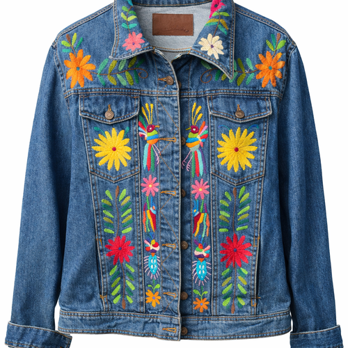 Chaqueta de Mezclilla Bordada Tenango Artesanal Mexicana | Hand Embroidered Denim Jacket Boho Floral Handmade